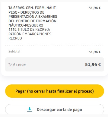 - Botón Blanco “Descargar Carta de Pago”, aquí se os genera un pdf para ir a un banco a paga la tasa