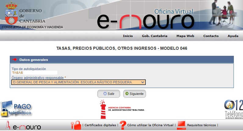 Para ello se debe acceder a la página de la Agencia Tributaria de Cantabria (modelo 046) y a contiuación “Tasas”: Hacienda Cantabria_046